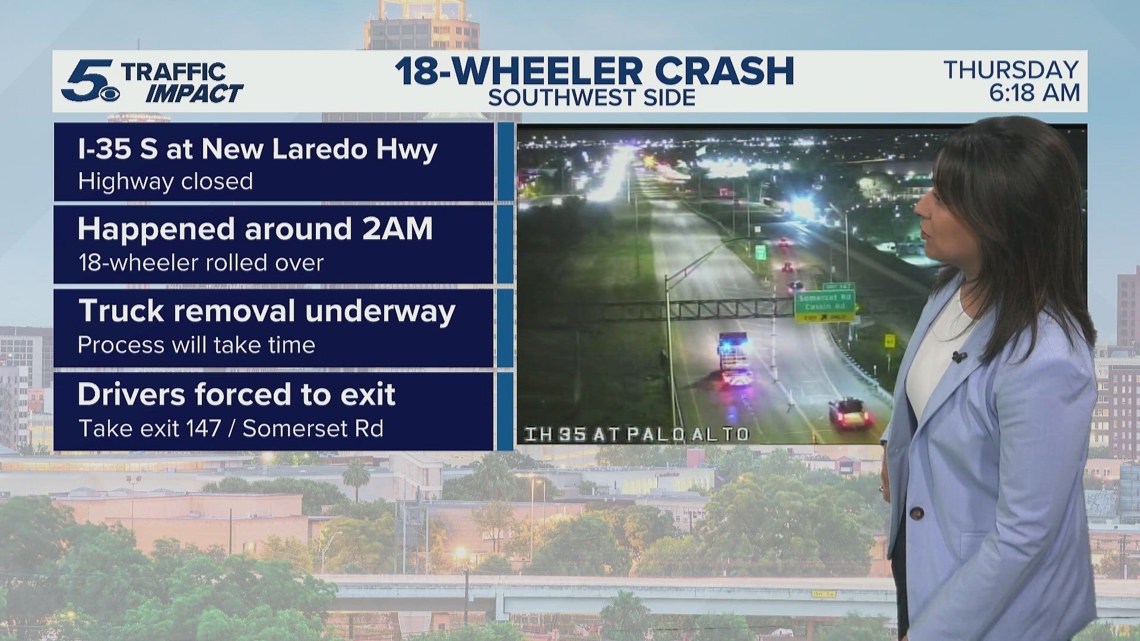 SAN ANTONIO — Drivers on the southwest side of San Antonio faced major delays early Thursday after an 18-wheeler rollover shut down part of Interstate 35.