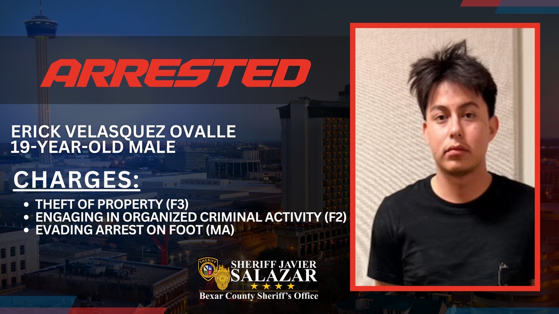 Erick Velasquez Ovalle, 19, faces charges of with theft of property, engaging in organized criminal activity and evading arrest on foot.