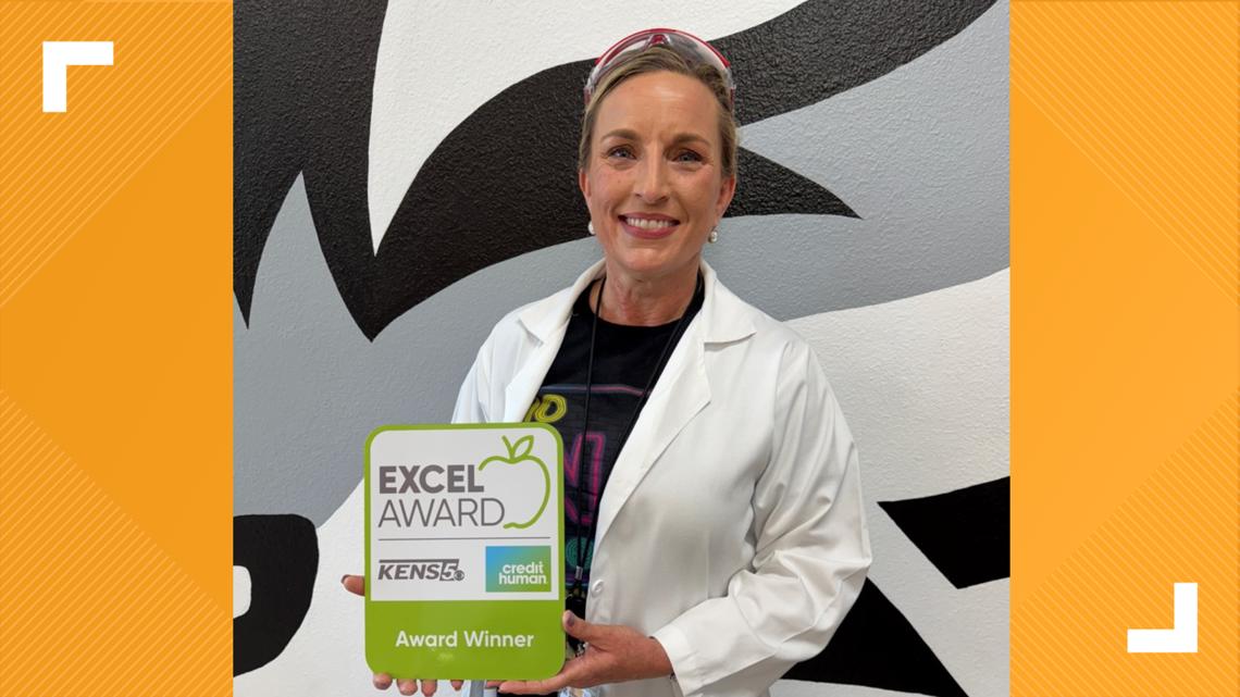 Medina Valley Middle School teacher, Angela Bowen, was surprised with the KENS 5 EXCEL Award and a $2,000 check from our partner, Credit Human.
