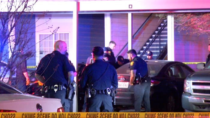 The suspect ran after being wounded, leaving a trail of blood throughout the apartment complex, located in the 8200 block of Micron Drive.