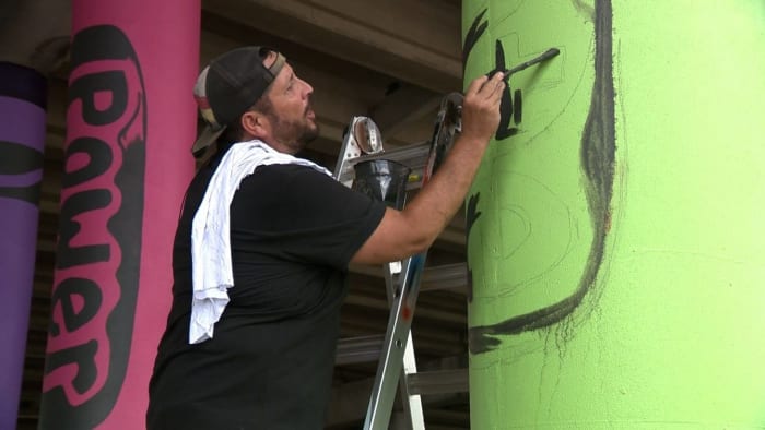 Monroe designed and painted the new art piece under Interstate 37 downtown. His “larger-than-life” crayons capture the city’s curiosity and unite the community.