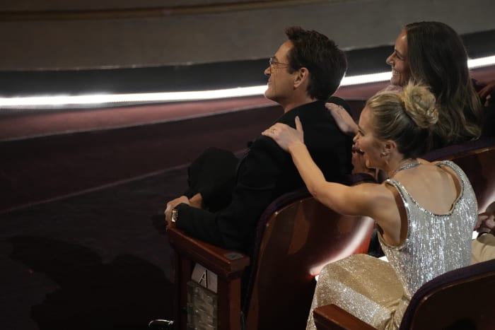 The Oppenhomies stayed up on the stage for a few minutes after the cameras turned off, hugging and celebrating all the wins. Downey held up his trophy doing a bit of a fist pump with it. Some of the last ones on the stage were Emily Blunt and Kimmel, who chatted casually and made their way out.