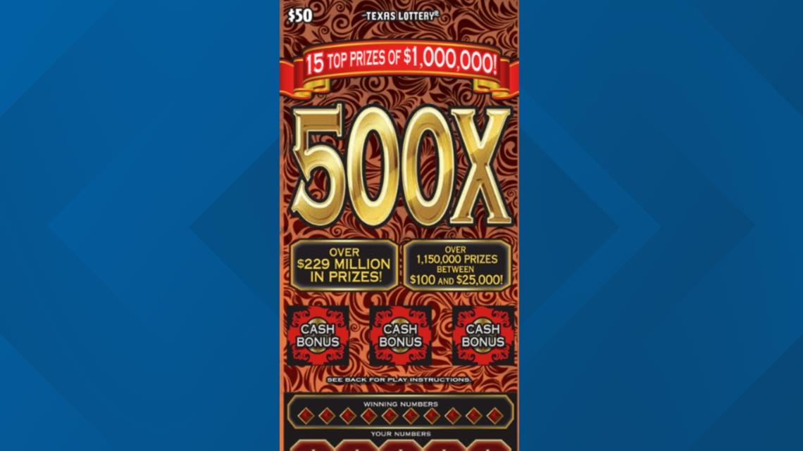 According to the Texas Lottery, this was the 11th of 15 top prizes worth $1 million to be claimed in this game. 500X offers more than $229 million in total prizes. Overall odds of winning any prize in the game are one in 3.36, including break-even prizes.