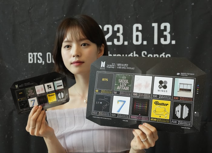 Messages congratulating BTS were displayed on digital screens in buildings across Seoul, while postal authorities issued stamps marking the group’s anniversary, which will be available at post offices starting Tuesday.