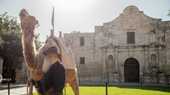 The camels will be in the Alamo garden during the event. The Alamo is located at 300 Alamo Plaza.