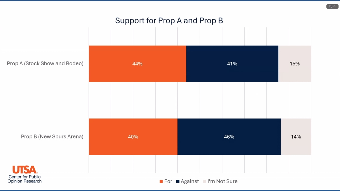 The UTSA poll showed for Prop A (Stock Show and Rodeo), 44% of people surveyed were in support, while 41% of people were opposed. For Prop B (New Spurs arena), 40% were in support and 46% were opposed.
