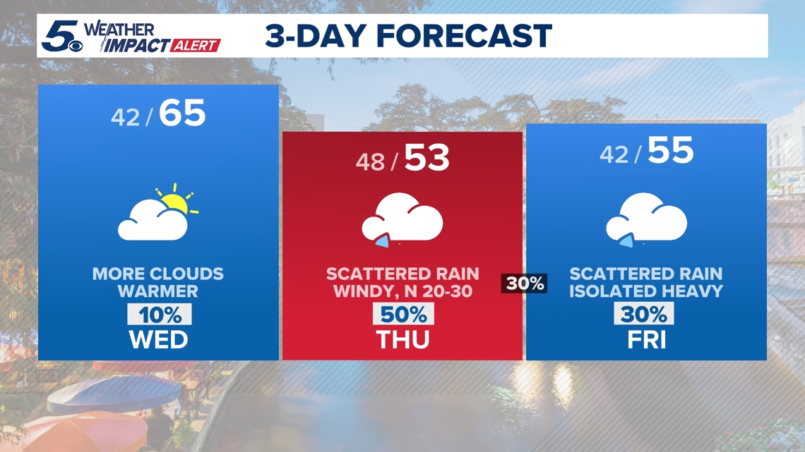 That’ll change Wednesday with a very brief and mild recovery in temperatures putting us back above 60 degrees. Areas south and west of the Alamo City will see temps near 70 that afternoon.