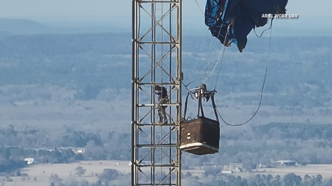 LONGVIEW, Texas — A specialized tower repair crew spent Sunday securing and preparing to remove a hot air balloon basket that became lodged near the top of a 900‑foot cell tower after a dramatic crash Saturday morning.