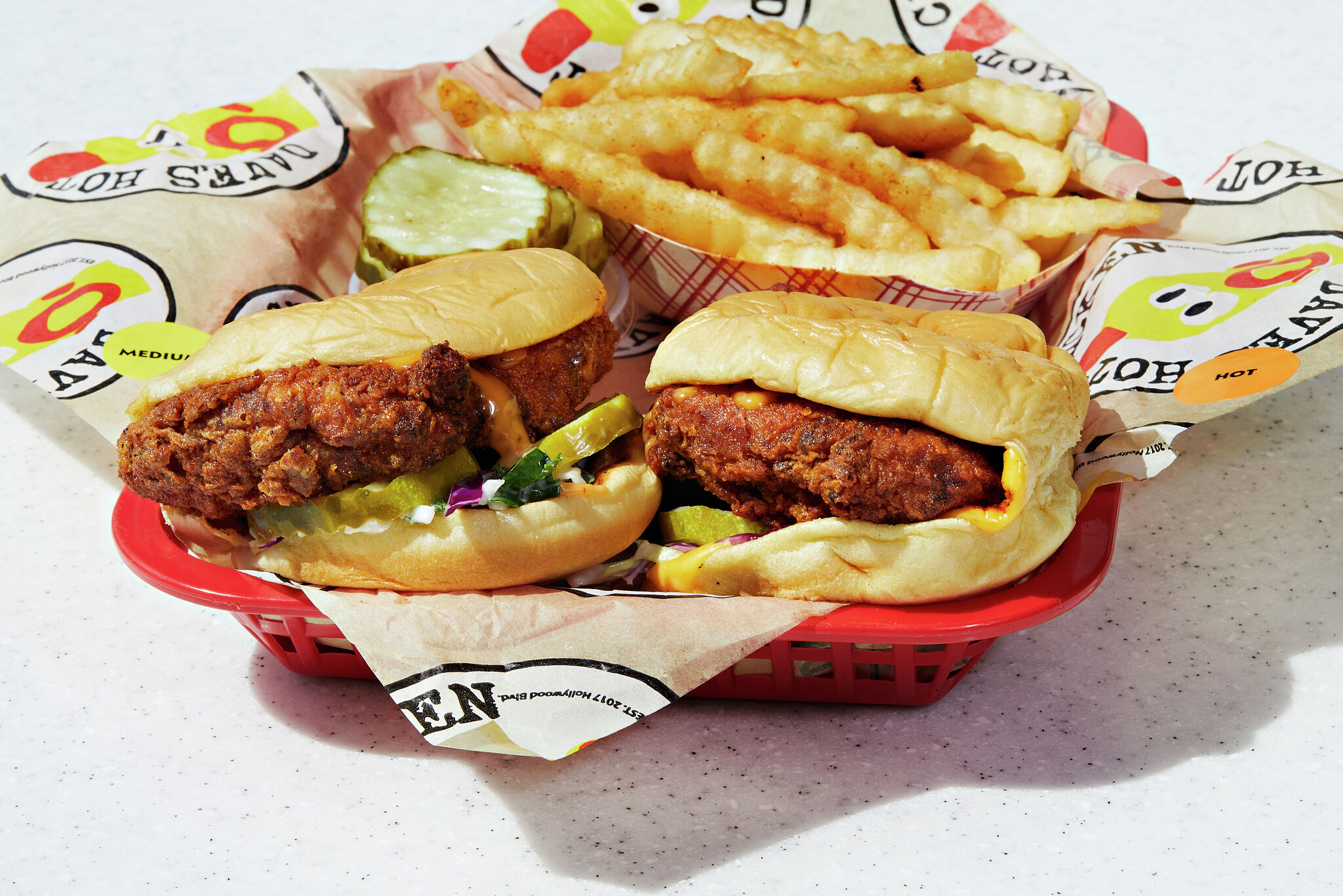 Founded in a parking lot in East Hollywood, California in 2017, the company “specializes in jumbo Hot Chicken Tenders and Sliders,” according to the company’s website. It also offers several sides, including “Kale Slaw,” macaroni and cheese, and seasoned crinkle fries. For those looking to slake their thirst, Dave’s also offers sodas, slushes and milkshakes.