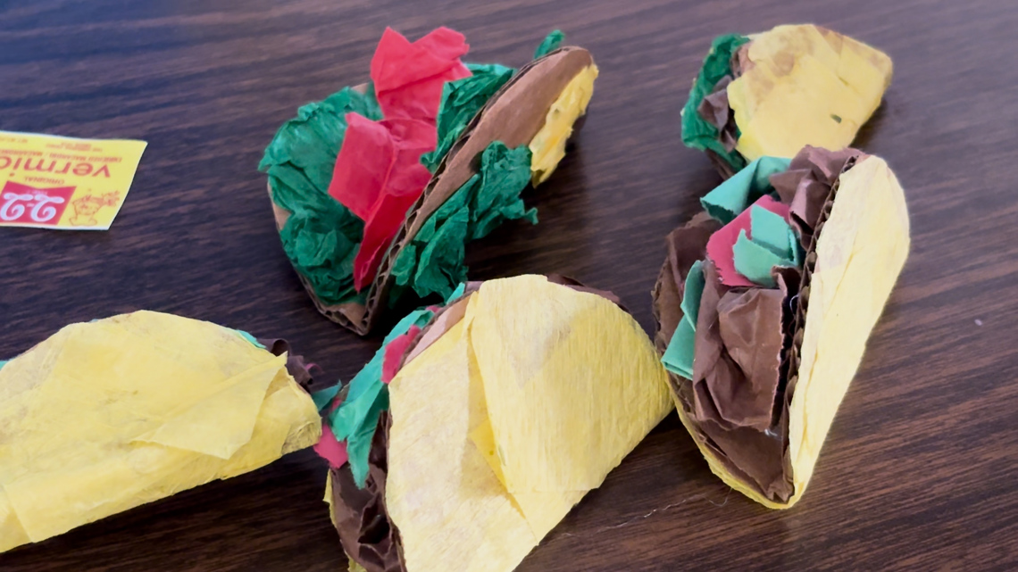 Across the classroom, the creativity continued at another table, where students worked on oversized cardboard tacos layered with colorful paper for meat, lettuce and tomatoes.