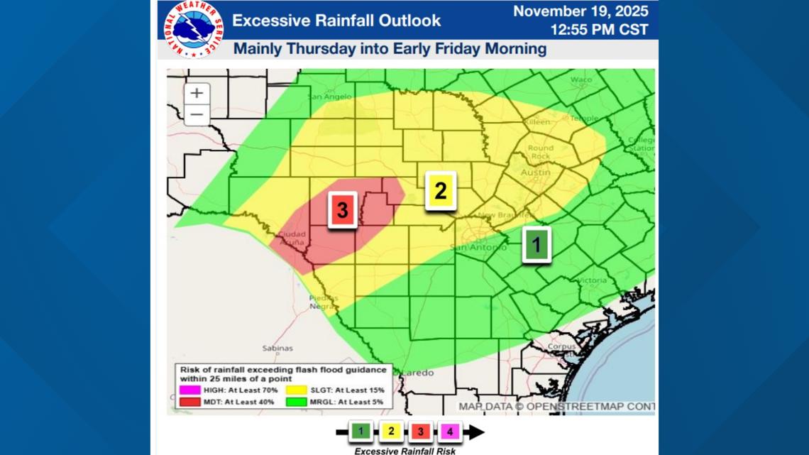 By the time Thursday night rolls around, north Bexar County will be in a Level 2 out of 4 risk for excessive rainfall, with south Bexar County in the Level 1 out of 4 risk area.