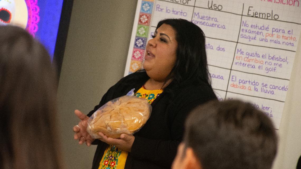 On this day, Sanchez-Saenz’s class was all about Dia de los Muertos—its indigenous origins, its traditions, its (literal) flavors. While discussing the symbolism of the pan de muerto, she took care to point to the intention behind the design baked into the bread (some students saw a flower, others a sun or a spider).
