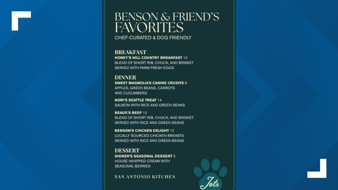 Dubbed “Benson & Friends Favorites,” the menu was created with the same care and creativity as Jots’ human offerings, the Gunter Hotel said. Each dish is made with recognizable ingredients designed to be both nourishing and indulgent for dogs.