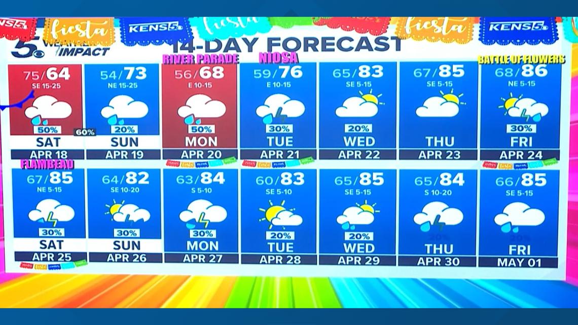 Chances for weekend rain in the Alamo City start at 50% for Saturday and 20% Sunday. The cold front will also usher in more refreshing temperatures; after an anticipated Friday afternoon high of around 91 degrees, the mercury won’t escape the 70s this weekend.
