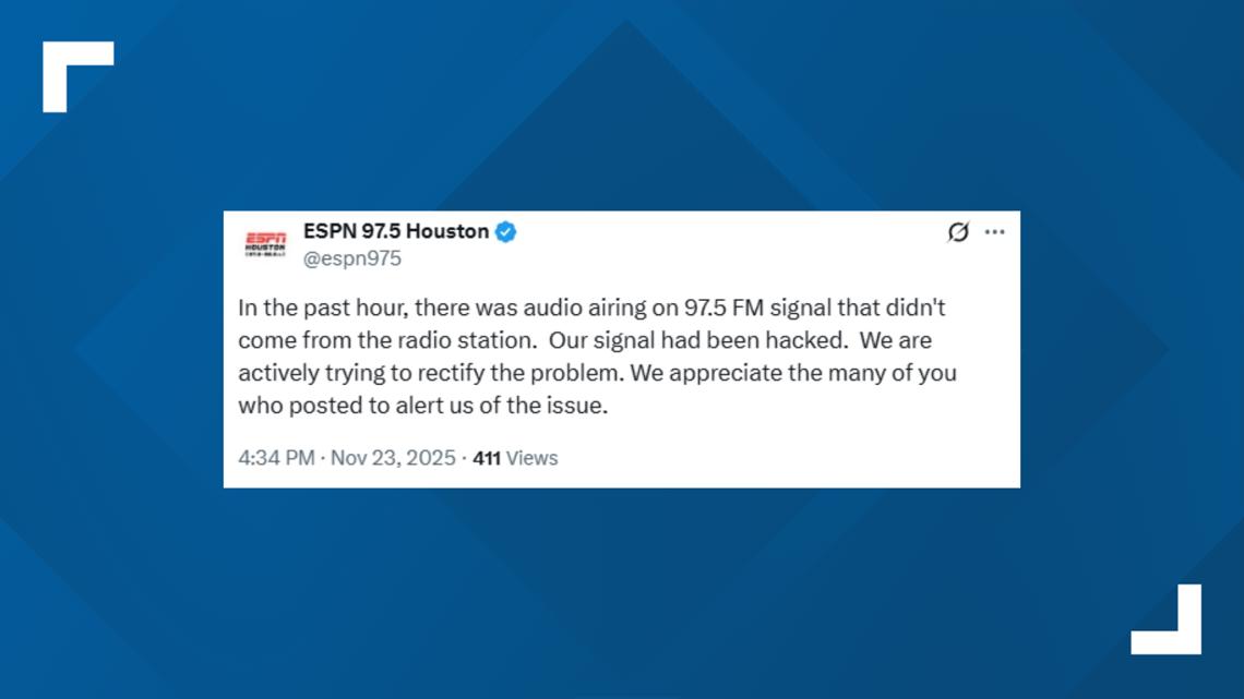 HOUSTON — Houston sports radio station ESPN 97.5 FM says its signal was “hacked” Sunday after unexpected audio began playing over the air.