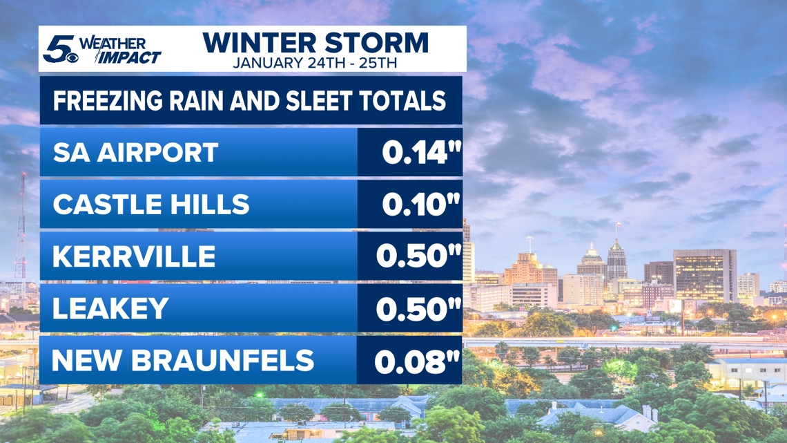 KENS 5 meteorologist Paul Mireles compiled the measurements for how much freezing rain and sleet fell in major areas around San Antonio and the Hill Country. Take a look at the chart below which shows the breakdown.