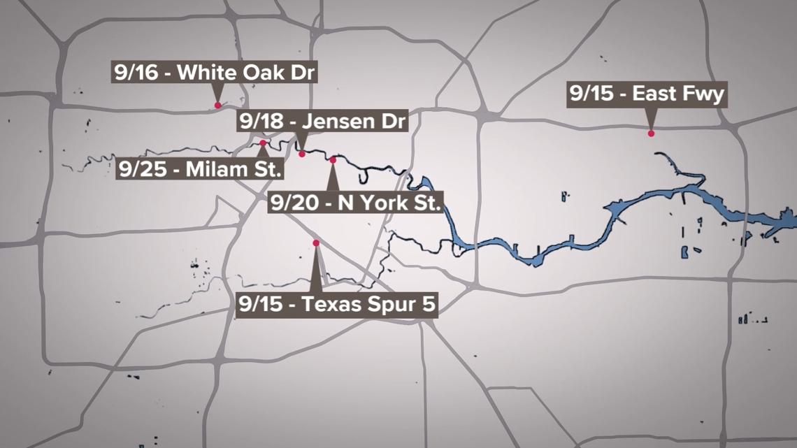 - Thursday, Sept. 18: Witnesses reported seeing someone jump into Buffalo Bayou near Jensen Drive and Navigation Boulevard and never resurface. He was later identified as 63-year-old Arnulfo Alvarado. That case was ruled a drowning.
