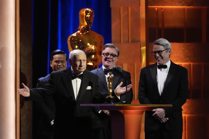 The 97-year-old, who began his career writing for Sid Caesar’s “Your Show of Shows,” and over the next 70 years would write, direct, act, produce for film, television and Broadway and write books, including a recent memoir, is among the rare breed of EGOT-winners. (Those are entertainers who have won Emmy, Grammy, Oscar and Tony Awards.) Lane joked that with this honorary award he’s now an “EGOOT” winner. He also received two other Oscar nominations, for writing the lyrics to John Morris’ “Blazing Saddles” song and another screenwriting nod for “Young Frankenstein,” which he shared with Gene Wilder.
