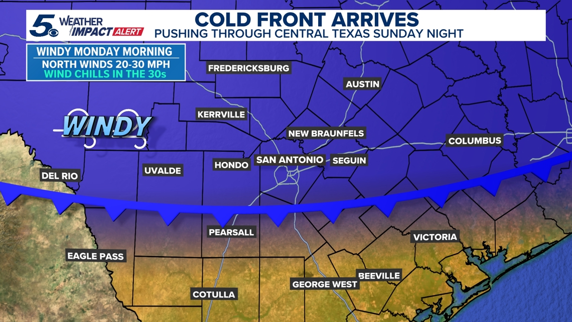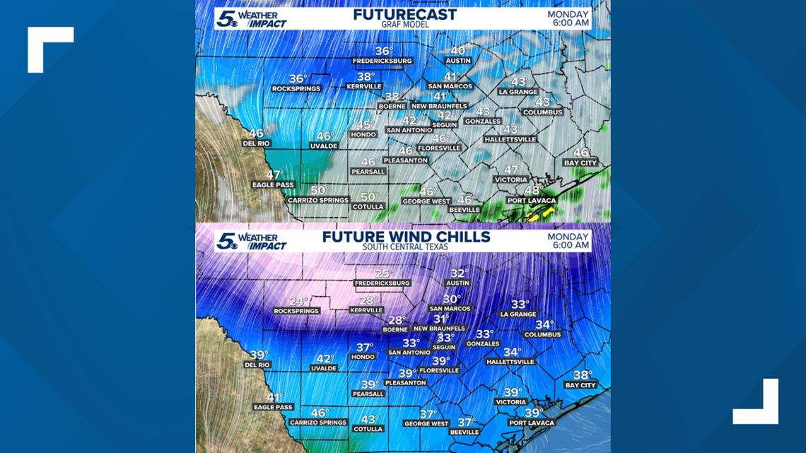 Winds pick up Monday morning, gusting near 35 mph. Wind chills drop below freezing in spots, especially in the Hill Country.