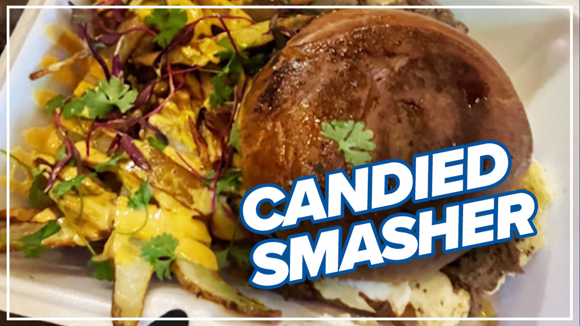 He has the candied smasher, which is a smash burger with a cream cheese spread, and candied jalapenos.