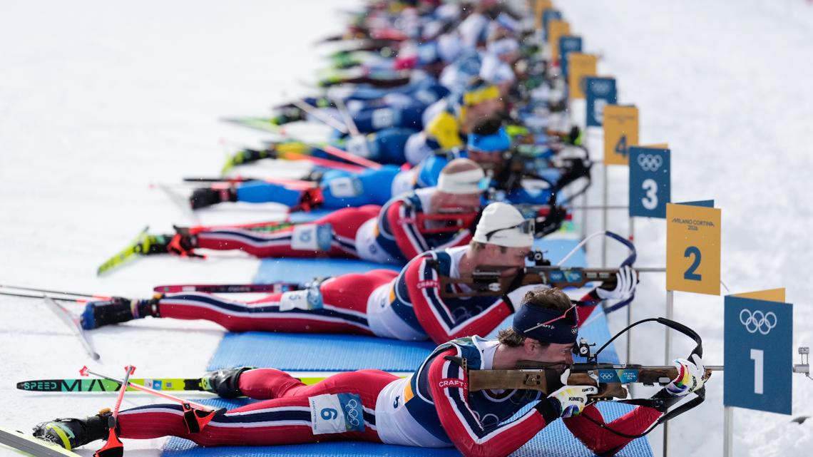 Only the top 30 biathletes compete in the mass start race — based on World Cup rankings and Olympic performance. They ski five, 3-kilometer loops, shooting twice in the prone position and twice standing.