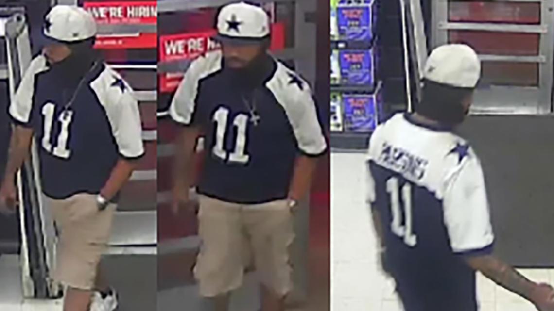 San Antonio police seek help identifying a robbery suspect in a Dallas Cowboys jersey who showed a gun during the theft.