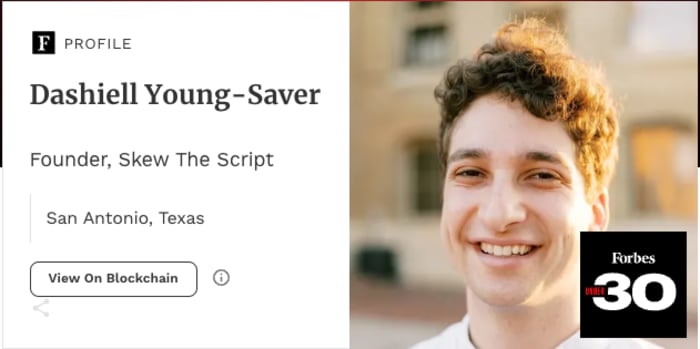 “Dashiell Young-Saver asked his students what they really wanted to learn. He heard answers of voter power, food deserts, the Spurs’s chance to win the NBA title, online dating and more. After infusing data about these topics into his lessons for a year, Young-Saver saw AP Statistics students’ passing rates jump from 2% to 42%,” his Forbes entry reads.