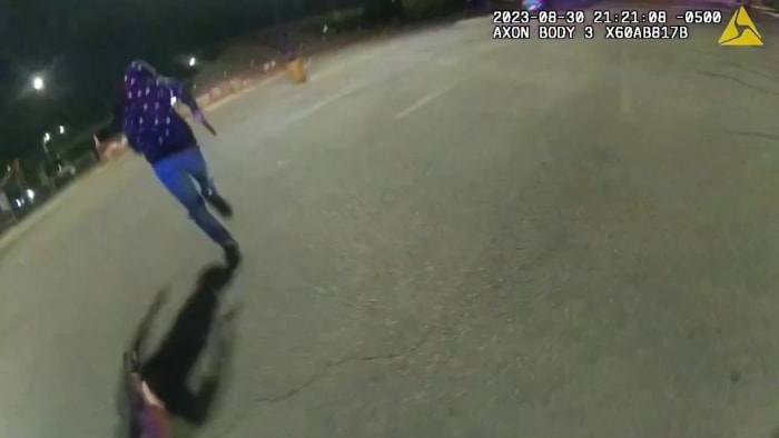 The body camera video then switches to the other officer involved in the foot chase, and he pulls his gun and aims it toward Fernandes.