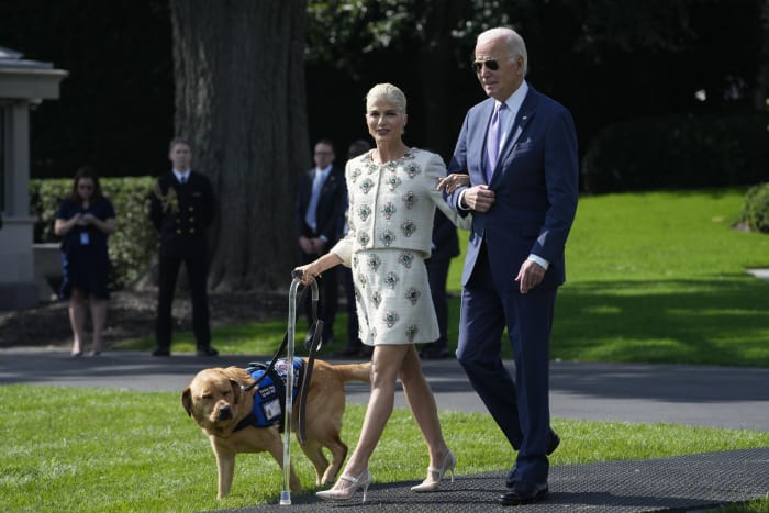 Blair, who was diagnosed with multiple sclerosis in 2018, walked together with Biden to a ceremony on the White House’s south lawn with her cane and her service dog, an English Labrador named Scout.