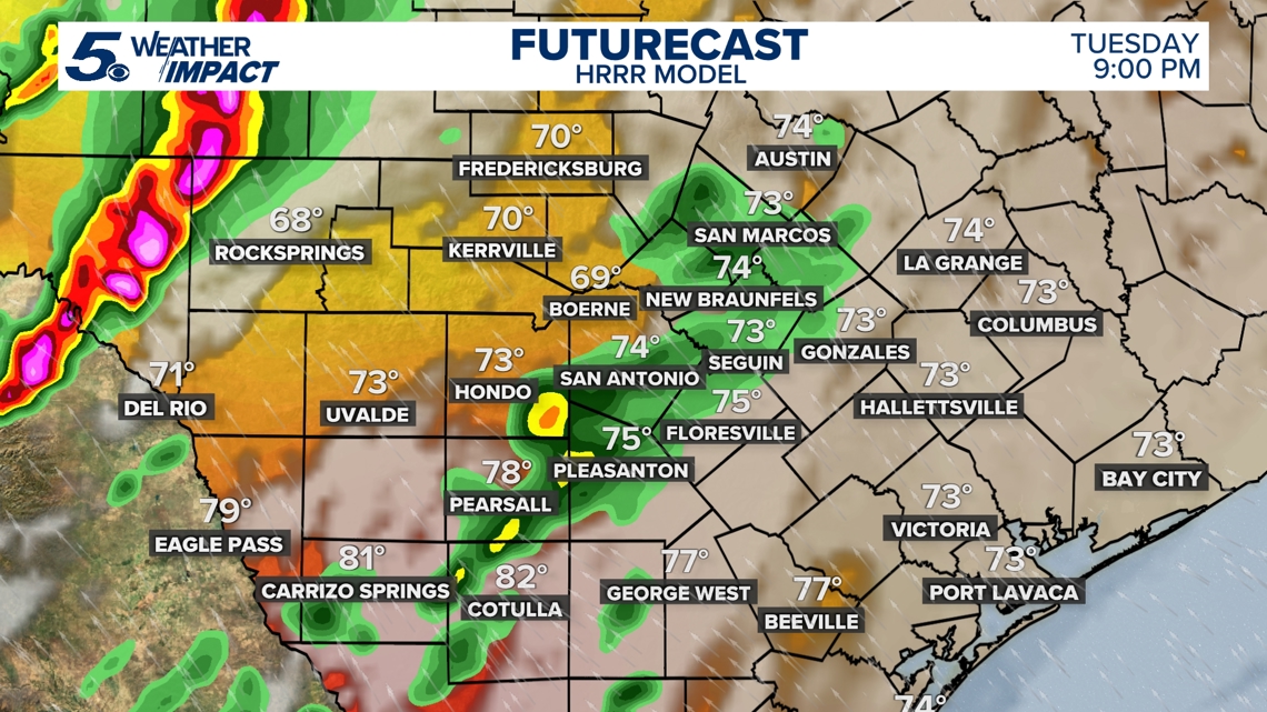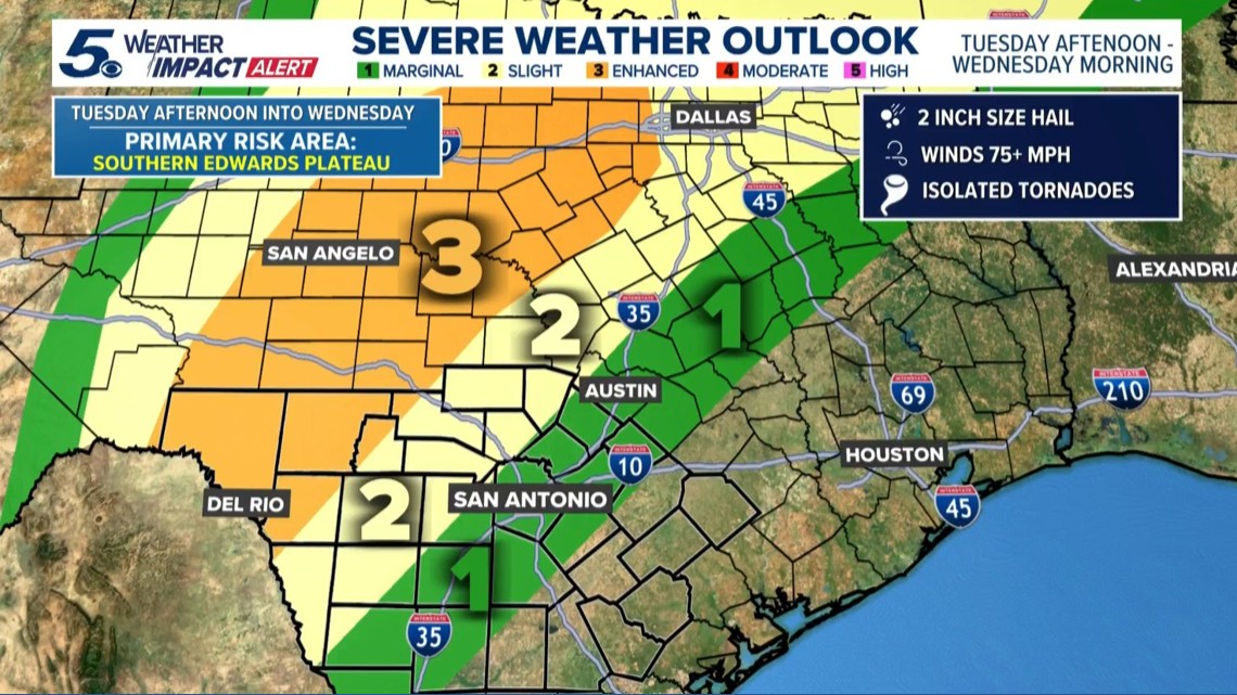 Communities further west, including Rocksprings and Del Rio, face the most severe threat with storms expected to start between 4 p.m. and 10 p.m. The National Weather Service says that area is in a heightened Level 3 out of 5 risk for severe weather starting Tuesday evening and heading into early Wednesday morning. The major threats: large or very large hail reaching up to two inches in size, damaging wind gusts of up to 75 mph, heavy rainfall and isolated tornadoes.