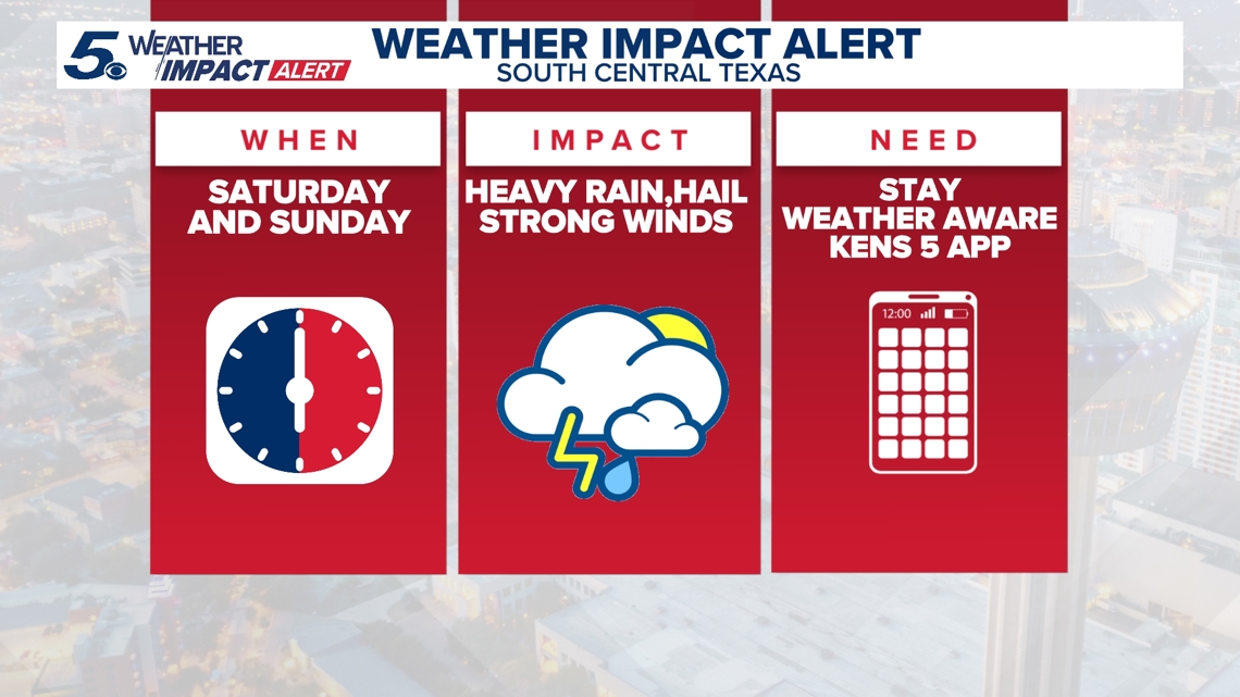 The biggest threats: Heavy rain, damaging winds and large hail. San Antonio, Boerne, Pleasanton and the Interstate 35 corridor are at a slight risk of excessive rainfall, although the NWS says it’s too early to gauge the potential for flash flooding.