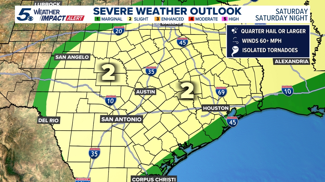 The most severe weather threat of the weekend, however, arrives Saturday. Virtually all of the South-Central Texas region faces a Level 2 out of 5 risk of severe storms.