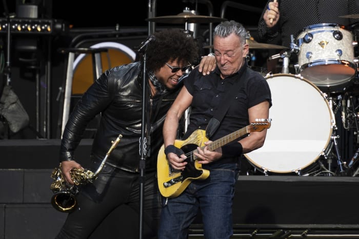 Saxophonist Jake Clemons, the nephew of Springsteen’s longtime sax player and friend, Clarence Clemons, who died in 2011, had his arm around Springsteen’s shoulder as they sang a seemingly countless string of la-la-la’s at the end of the song. Then, as he did throughout the night, Clemons took center stage and wailed on his sax that glimmered in the setting sun.