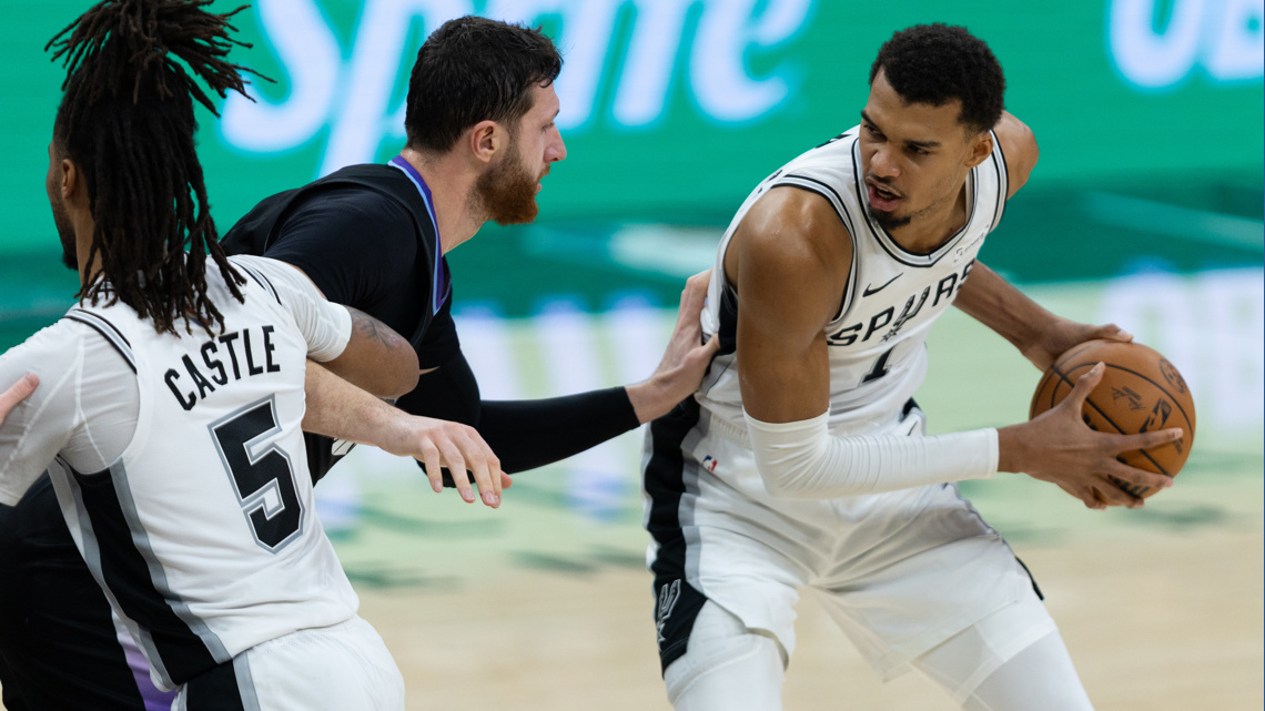 The Spurs were without De’Aaron Fox, who missed the game with tightness in his left adductor.