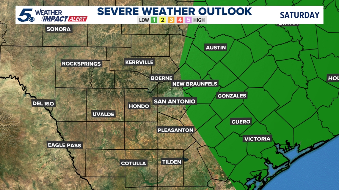 A marginal risk for isolated severe storms is in place highlighted in the green region closer to Houston. Again, this risk is for late Saturday.