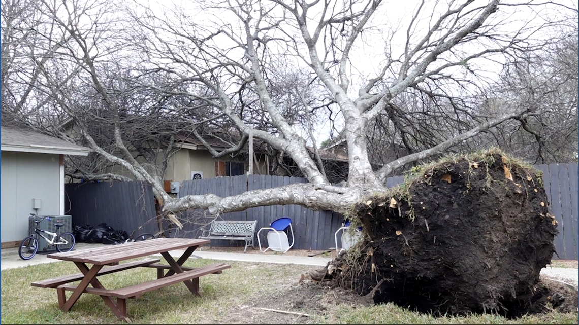 Large tree strikes San Antonio home after local wind gusts rise to 55 mph.