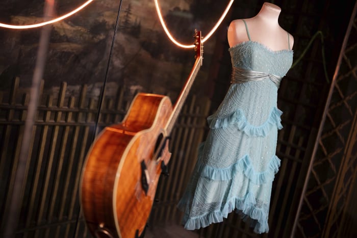Die-hard Swifties may recognize items in a display case dating back to an early tour in 2007 when she was a supporting act: pale blue heart-adorned cowboy boots, turquoise dress and a Taylor acoustic guitar made of koa wood.