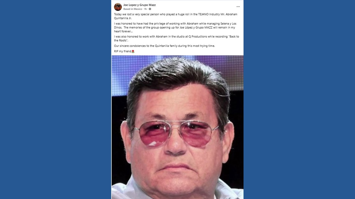 SAN ANTONIO — Hours after the news broke that Abraham Quintanilla, the father of Tejano queen Selena, had died, the Tejano community began sharing their condolences to honor the legacy of a music legend.