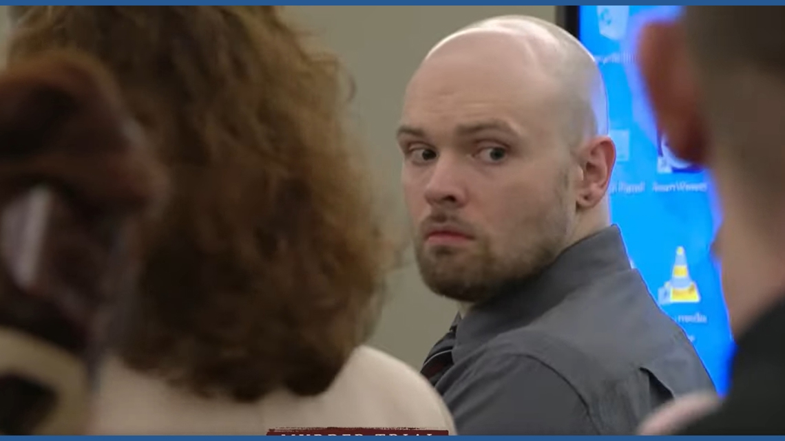 In the courtroom, while this section of the video is playing, Tanner Horner sits with his elbows on the defense table, his chin on his fists, his expression blank,