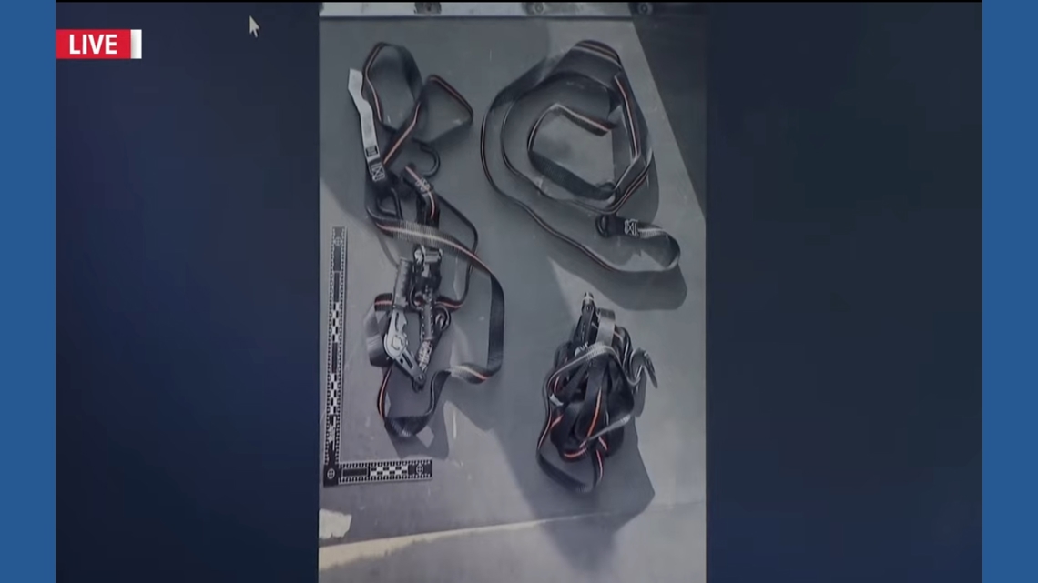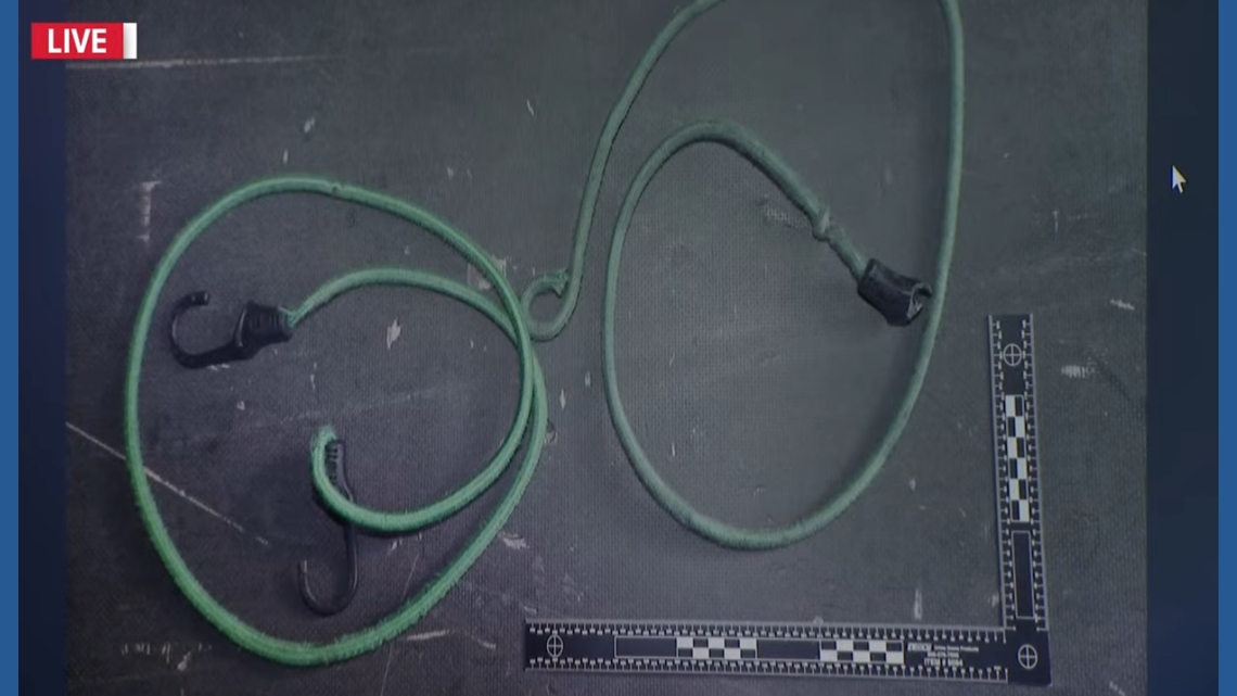 Prosecutors showed jurors pictures of tie-downs and bungee cords found inside the van. Defense lawyers objected to them coming into evidence, presumably because the may have been used in the attack on Athena.
