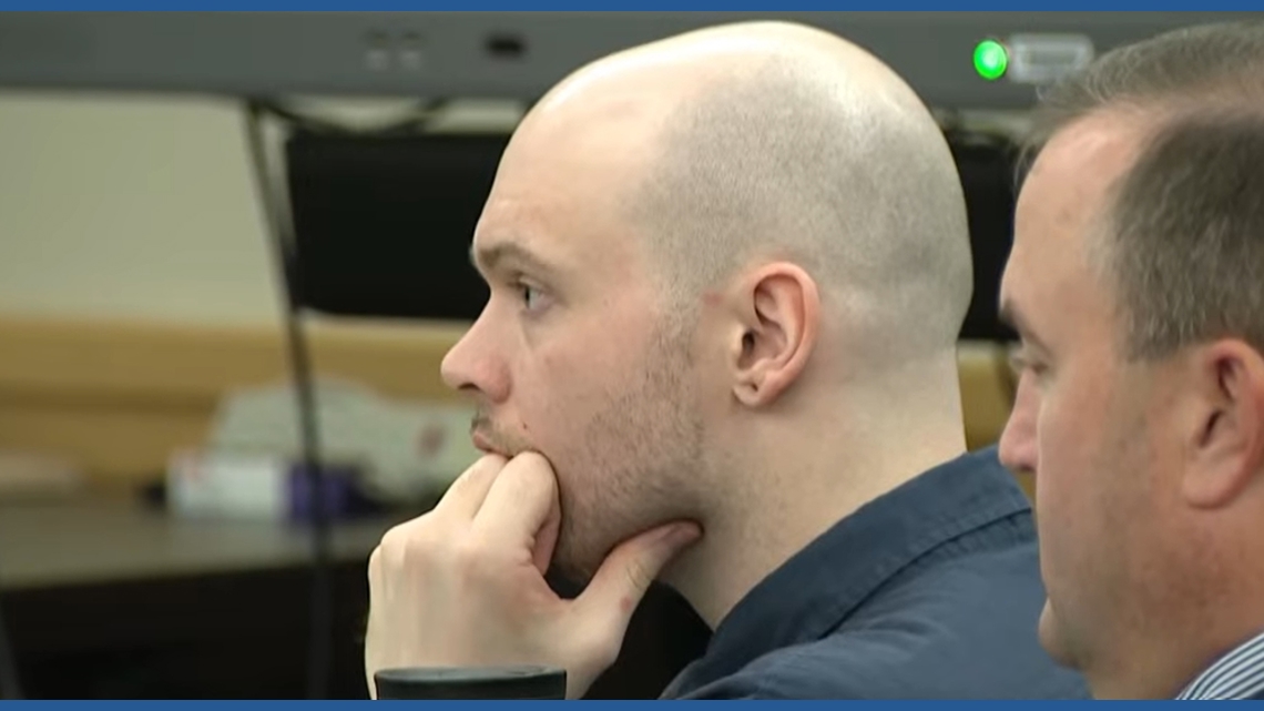 In the courtroom, while this section of the video is playing, Tanner Horner sits with his elbows on the defense table, his chin on his fists, his expression blank,