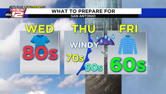 A cold front arrives in South Central Texas on Thursday, pushing through the Hill Country in the morning, then moving into the San Antonio area around midday