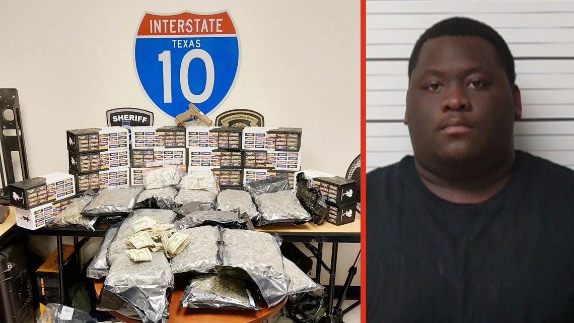 The suspect was arrested after a traffic stop on Interstate 10 led to the discovery of drugs, a handgun, and thousands in cash, according to KCSO.