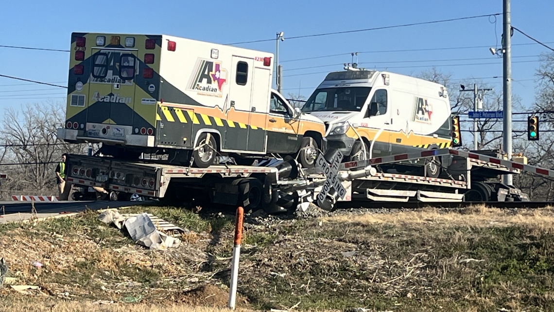 Officials say the train struck an 18-wheeler, which was carrying several Acadian Ambulances. The train did not derail.