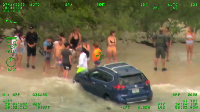 ORLANDO – Helicopter cameras and police body camera video captured by the Volusia Sheriff’s Office show a car in tire-deep water at a Florida beach shortly before the driver was taken into custody over the weekend.