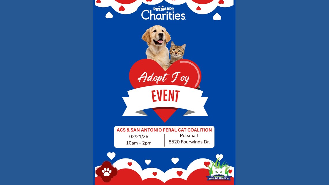 The event will take place from 10 a.m. until 2 p.m. at the PetSmart at Windcrest, located at 8520 Forwinds Drive. Animal Care Services will have dogs available for adoption, while the San Antonio Feral Cat Coalition (SAFCC) will feature cats.