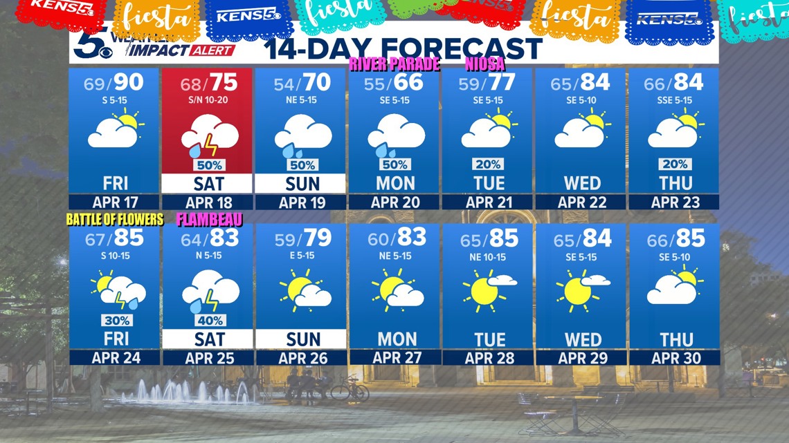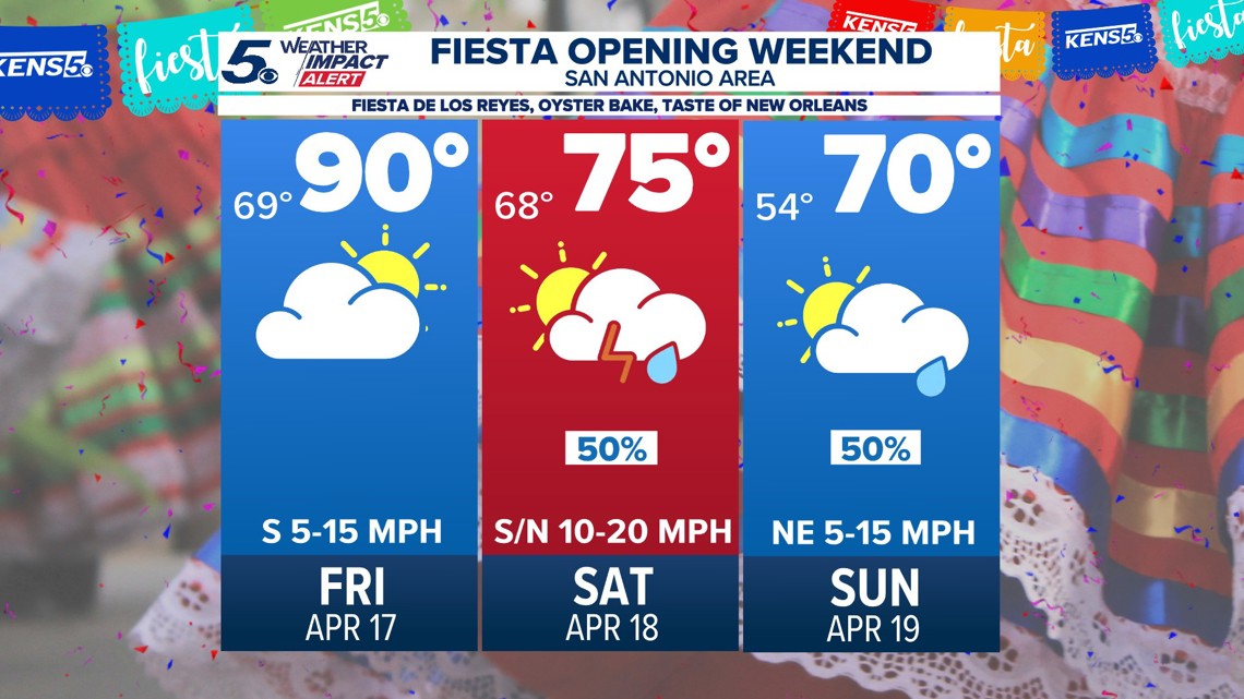 While Thursday and Friday are bringing partly cloudy skies and warm afternoons to San Antonio, there’s a solid chance of rain and possible storms over the first weekend of Fiesta—when fan-favorite events like Oyster Bake, Fiesta Fiesta and Taste of New Orleans are getting underway.