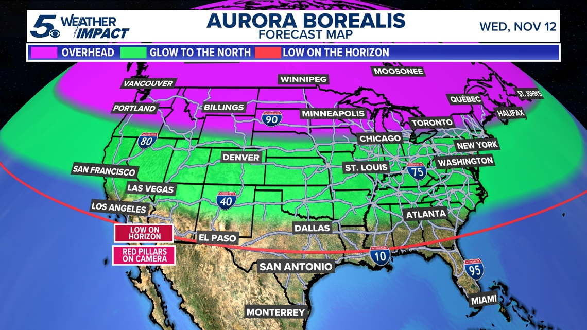 That goes for Texas, too, where folks in Dallas and the Panhandle will have the best views on Wednesday night. Here in the Lone Star State – including San Antonio – the aurora will be visible low on the horizon, so make sure you’re looking in all directions to spot them.